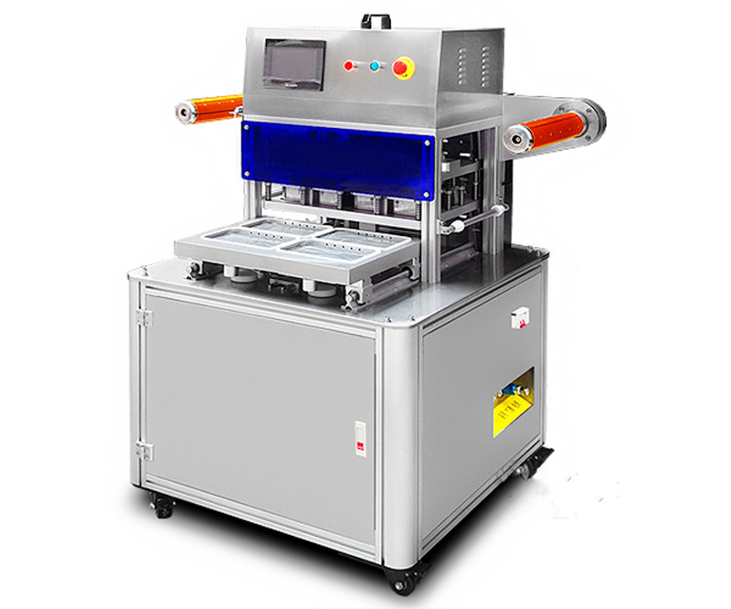 放盒→按開關→下(xià)模進入(到位)→上模(mó)向下與下模合模(到位)→去除自然空氣→充入混合保鮮氣體(N2、O2、CO2 等)(完畢)→密封封口、切膜→放氣→上下模具分開→下模退(tuì)出、包裝成品(pǐn)頂出(chū)→拿出成品。