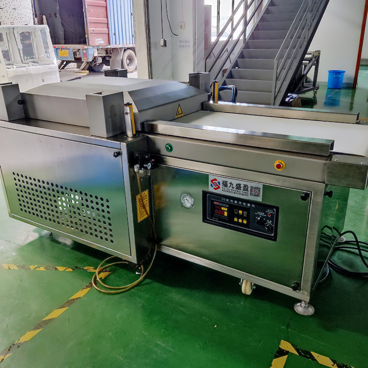 我向您隆重推薦我們公司自主研發(fā)、設計製造的這款橫向連續真空包裝機。這款全自動(dòng)真空包裝機在普通包(bāo)裝機的基礎上進行了創新,具備了(le)高(gāo)度的自動化程度(dù)。當人(rén)工在擺料區放置好物(wù)品後,輸(shū)送帶將自動將物料輸送到工作室。工作室將自(zì)動(dòng)下降,完成(chéng)真空和封口操作,然後再次上升,將(jiāng)已包裝好的物品自動輸送出去。這一過(guò)程不僅極大(dà)地節省了(le)人力(lì)和時間,而且還特別適(shì)合用於(yú)包裝大塊的牛(niú)羊肉以(yǐ)及大型物料。下料區可便捷地(dì)與熱縮機連接,進一步提升工作效率。