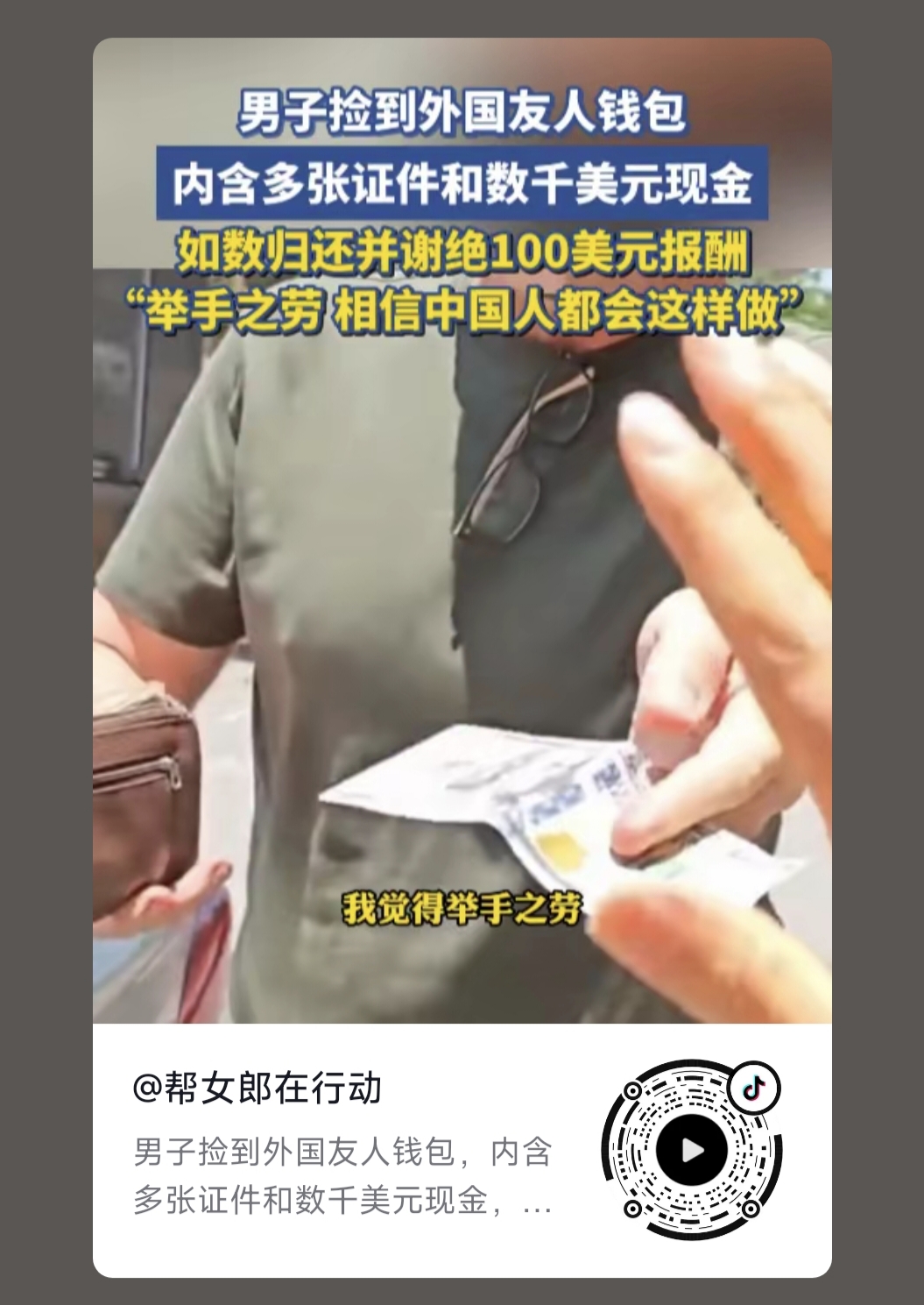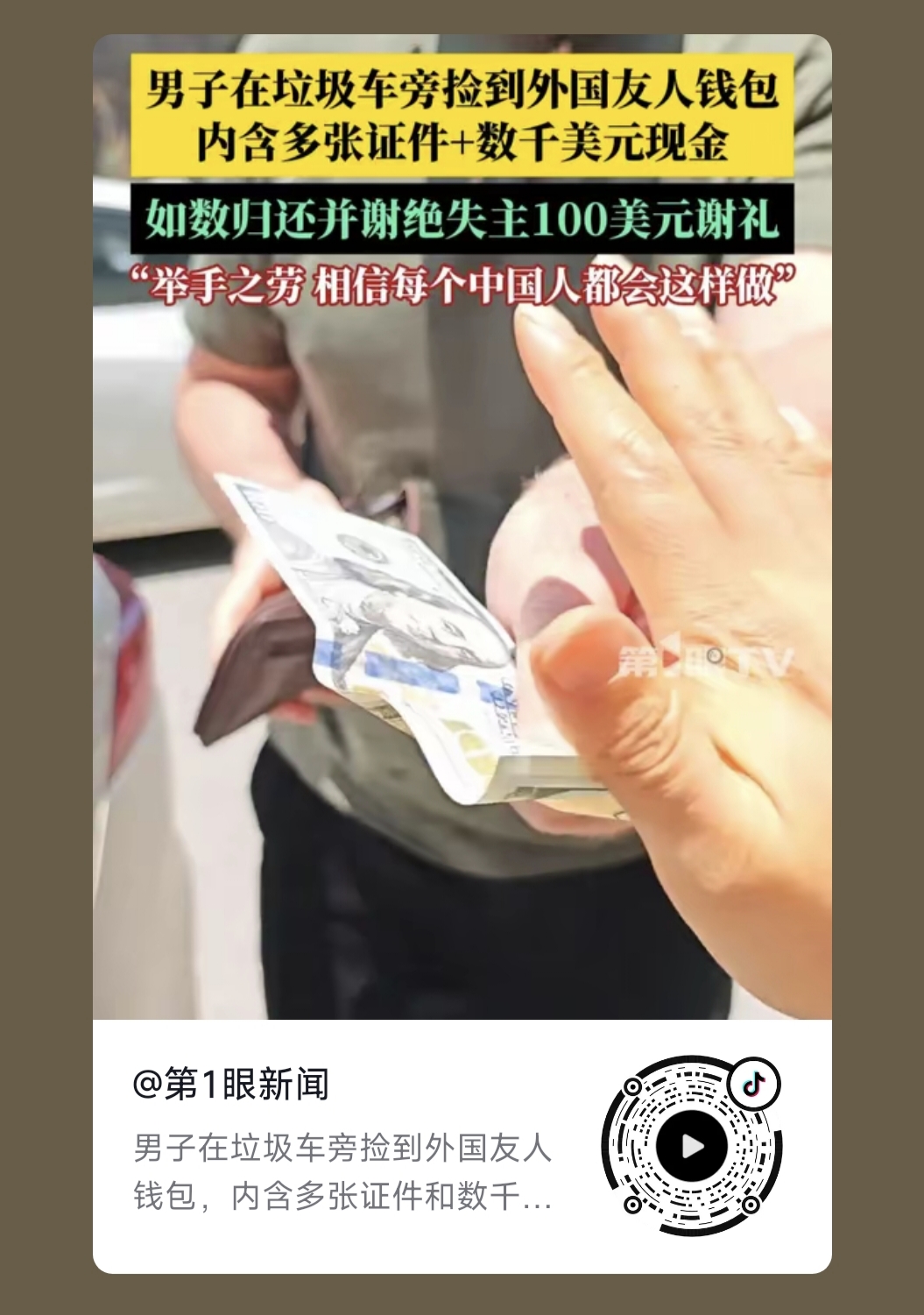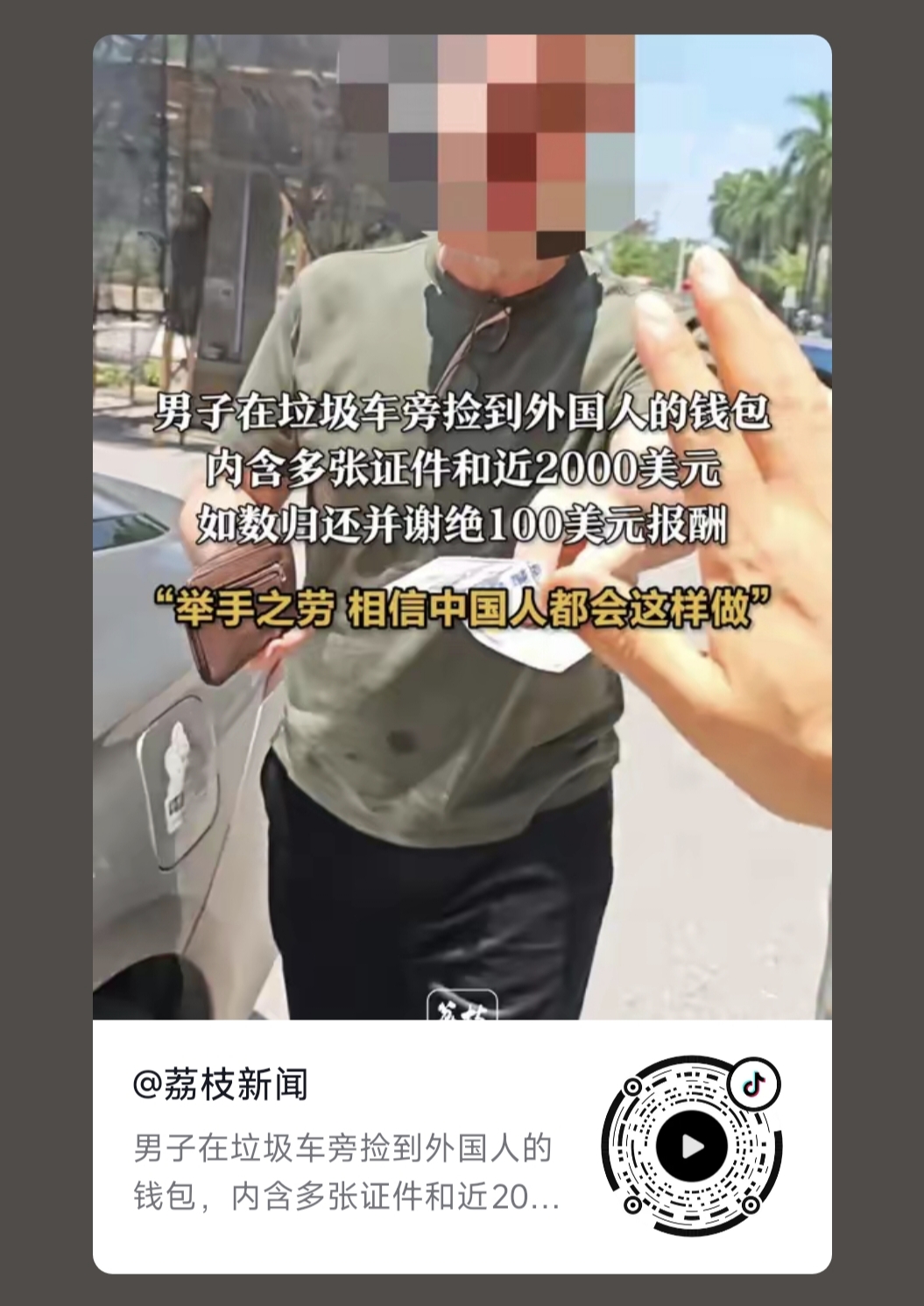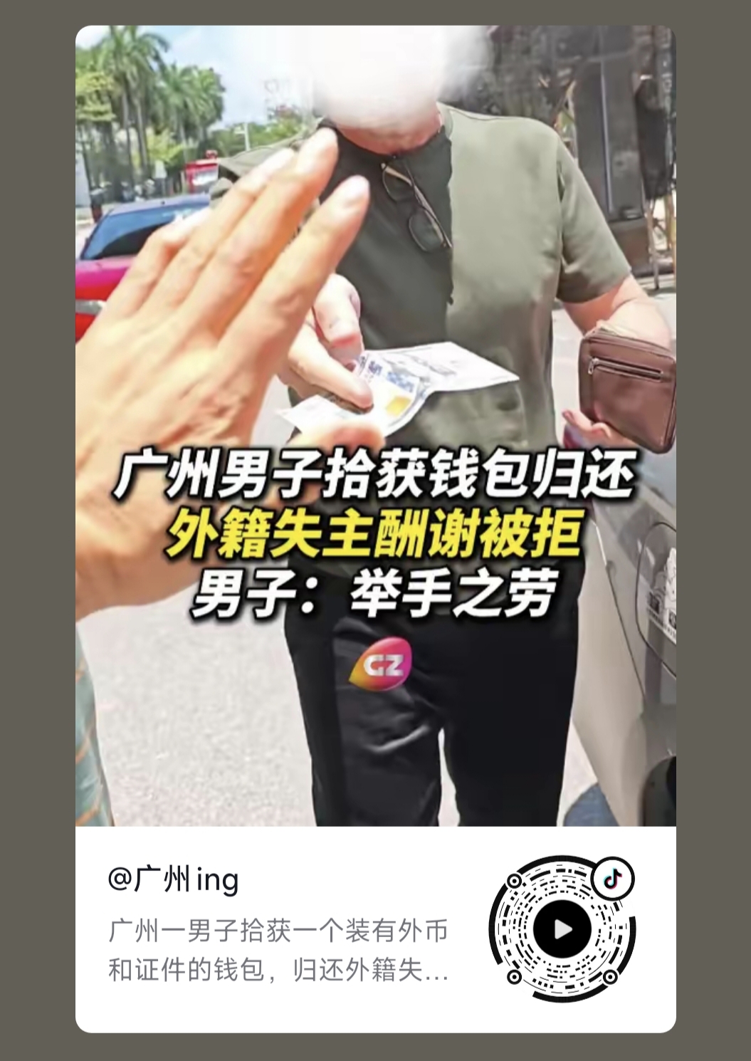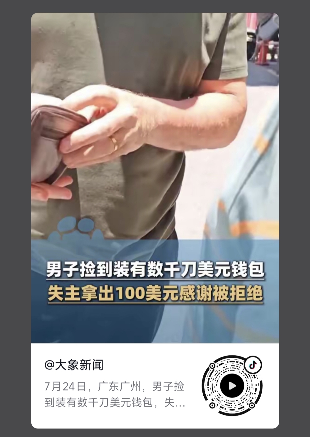 2025年7月24日中午,我公司職員劉先生撿到(dào)了一個裝有美金(jīn)和證件的錢包,經確認是一(yī)個外(wài)國人(rén)丟(diū)失的,並在第一時間和他的翻譯取得聯係,當麵把錢包(bāo)送到外國人手裏,現場的外國人掏出一百美金給(gěi)予酬(chóu)謝,被我公司職員劉(liú)先生拒絕了,此事引起社會粉絲及大眾媒體高度關注,一度成為熱點(diǎn)榜第一,形(xíng)成了多個焦點爭論(lùn):