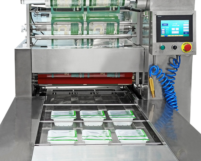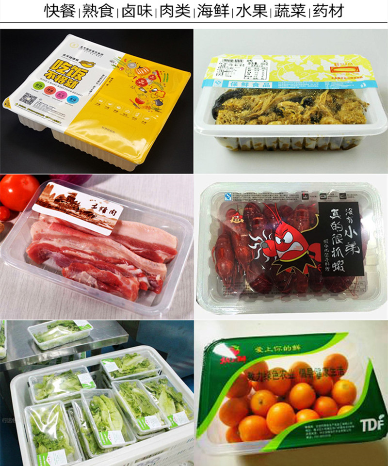 氣調保(bǎo)鮮包(bāo)裝(zhuāng)原(yuán)理:通過電器(qì)控製係統控製執(zhí)行係統的氣缸,完成下模(mó)的進出(chū)和與上(shàng)模的分模(mó)、合模、熱(rè)封、切膜及收(shōu)膜的步驟(zhòu)等(děng)。放盒→按開關→下模(mó)進入(到位)→上模向下與下模合模(到位)→去除自然空氣→充入混合保鮮氣(qì)體(N2、O2、CO2 等)(完畢)→密封封口、切膜→放氣→上下模具分開(kāi)→下模退出、包裝(zhuāng)成品頂出→拿出成品。