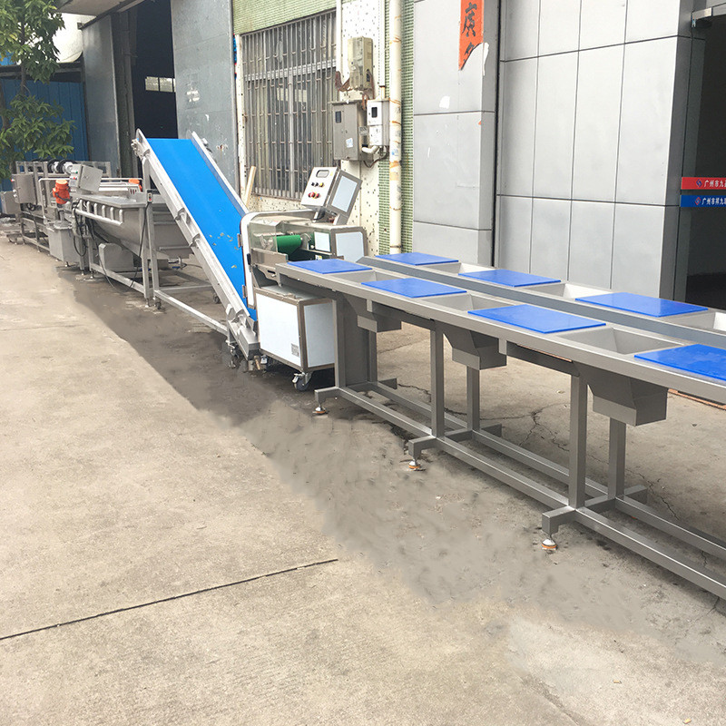 本生產線一(yī)共5 台(tái)設備,分為雙層挑選機—切菜(cài)機—提升機—鼓泡清洗機--—風幹機(震動瀝水),整條生產線(xiàn)的總功 率約(yuē)10 千瓦,長度為12 米,整條生產線設計合理,外觀大方,產量(liàng)可定做