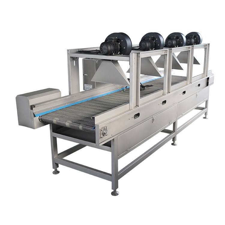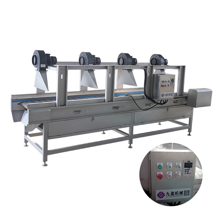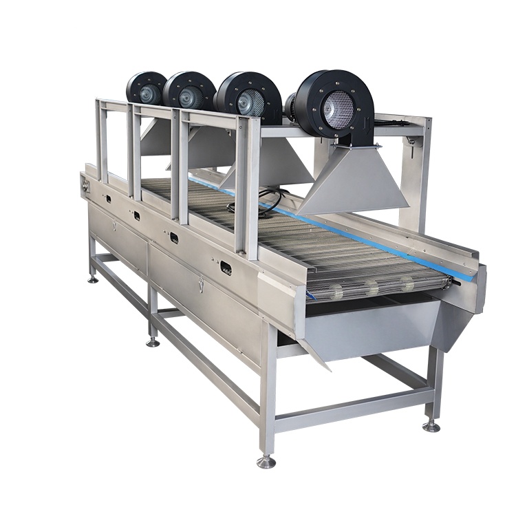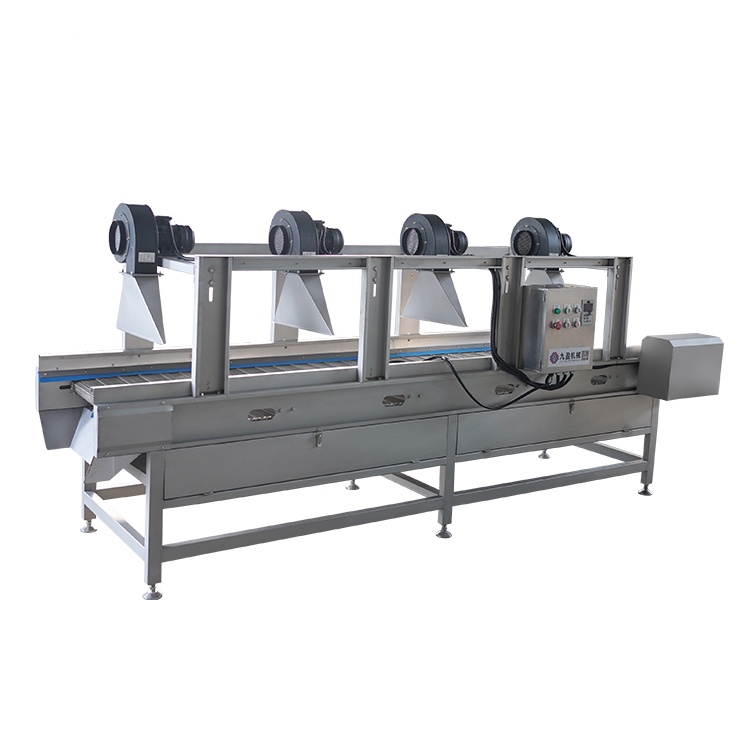 震動風幹機: 震動風幹機為新型的(de)蔬果除水設備,主要用於清洗後果蔬的表麵除水,震動吹幹機改變了傳統離心脫水機帶來的蔬菜葉(yè)子損傷和傳統吹幹(gàn)機的除水不等問題,蔬果切割後清洗後進入震動風幹機(jī),在震動(dòng)頻率下使物(wù)料向(xiàng)前傳送,在傳送過程中經過多次強風吹落物料(liào)表麵的多(duō)餘水分,使其蔬(shū)果表麵無水鮮亮。 本(běn)機主要適用於食品加工企業使用,該設備有結構簡潔、風幹效果好、不破(pò)壞蔬菜內部營養成分的特點,分滾杠和網帶式兩種。在淨菜生產(chǎn)線中是不可或缺的風幹設備,滿(mǎn)足生產的自動化的需要。該機具有(yǒu)操(cāo)作簡便、結構緊湊、造型美觀、維(wéi)修方便(biàn)等優點。